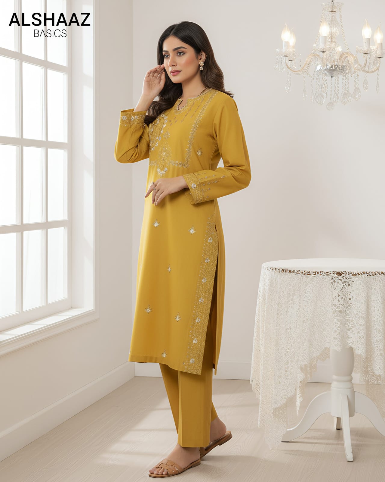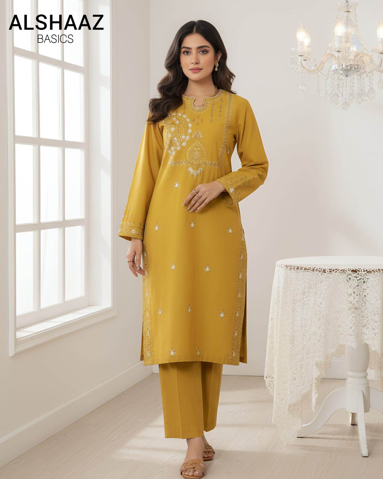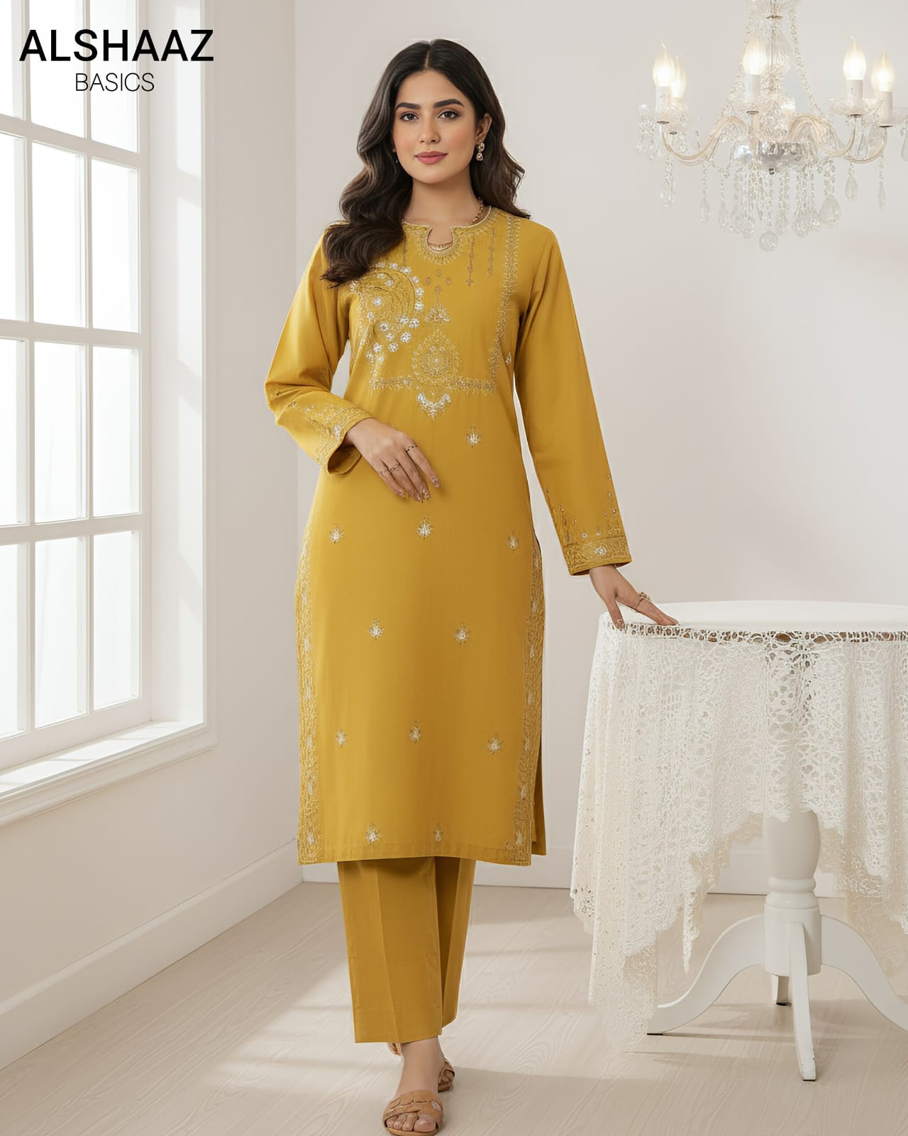 Step into effortless style with our Ready-to-Wear Mustard Khaddar 2-Piece Suit from Alshaaz Basics. Tailored in premium khaddar fabric, this outfit is designed to keep you comfortable and chic during the season.