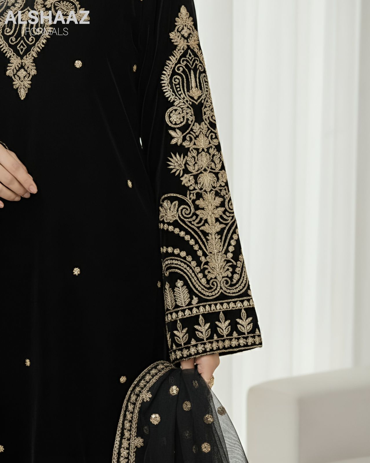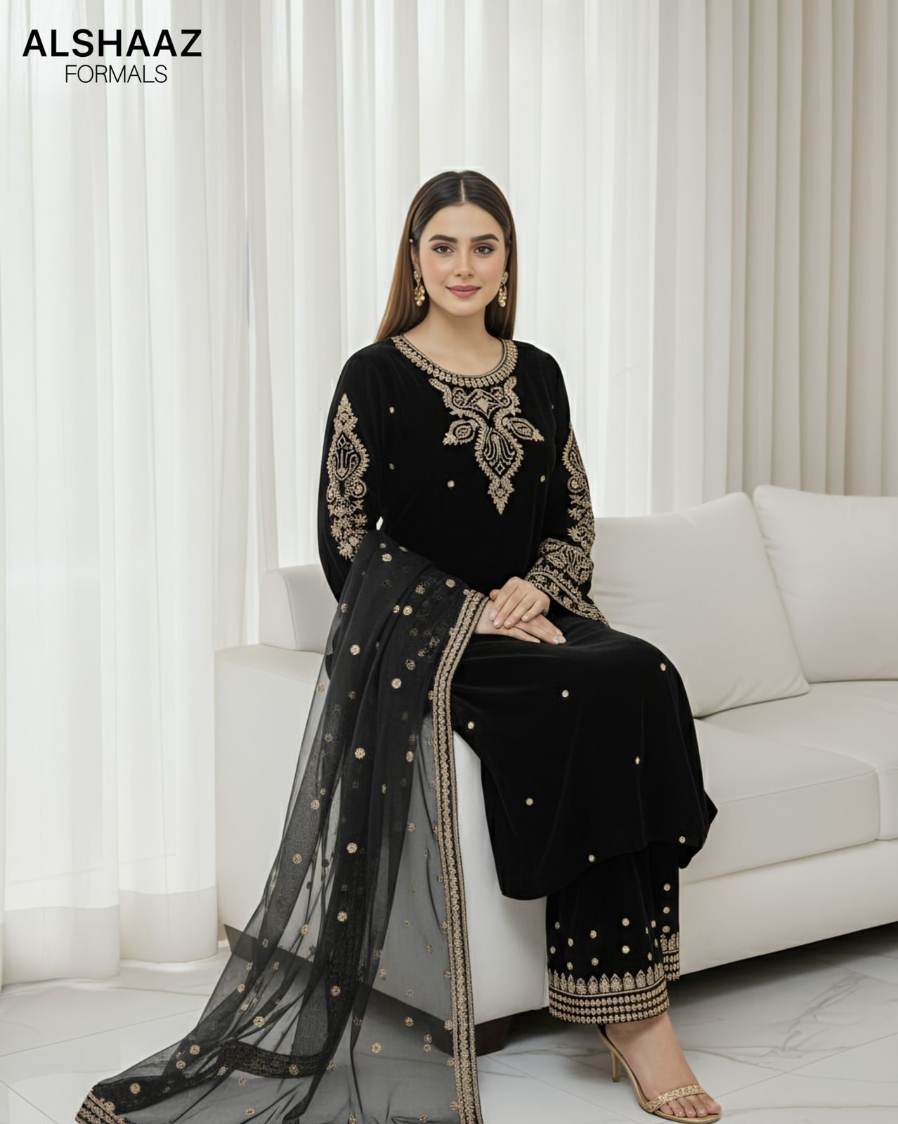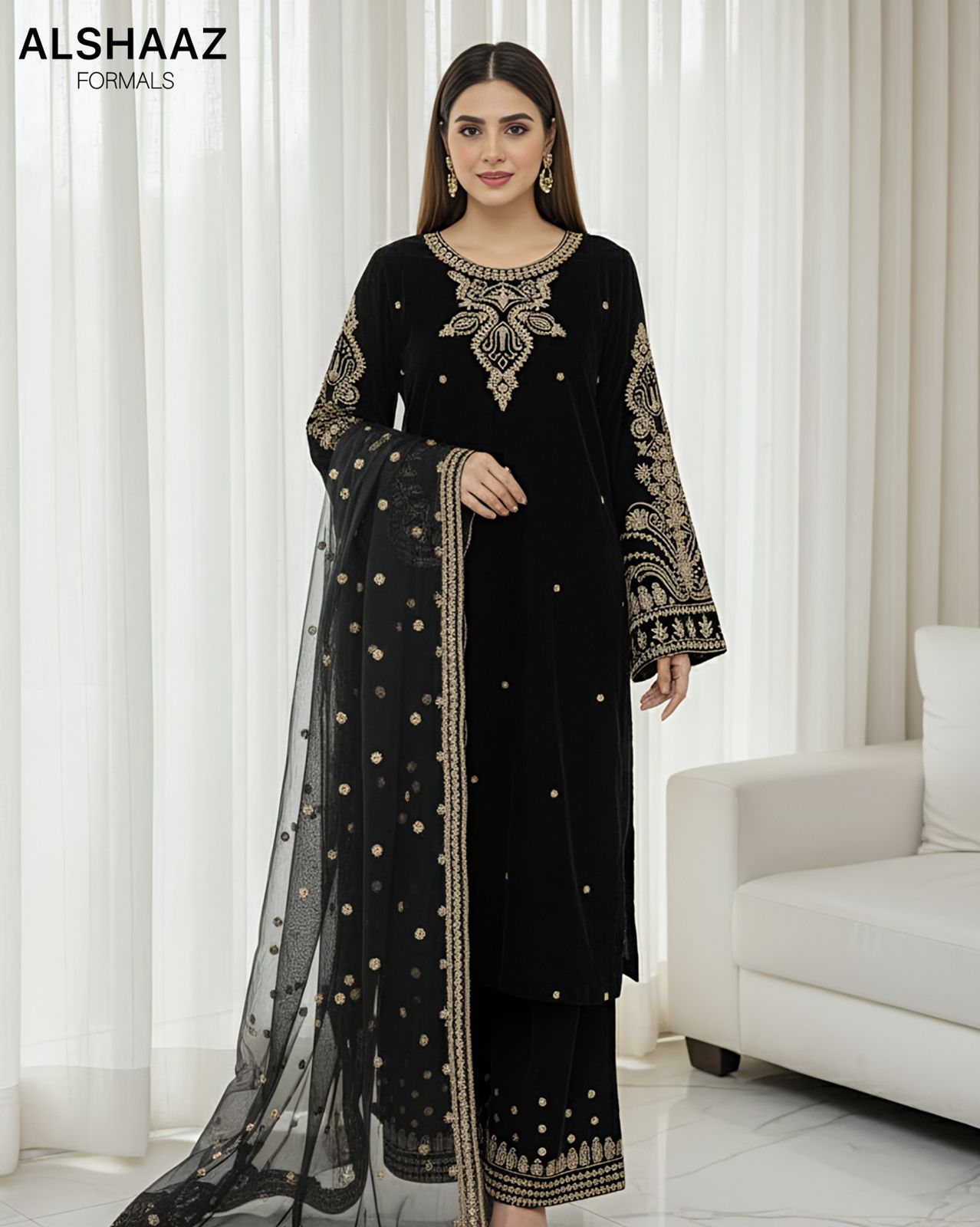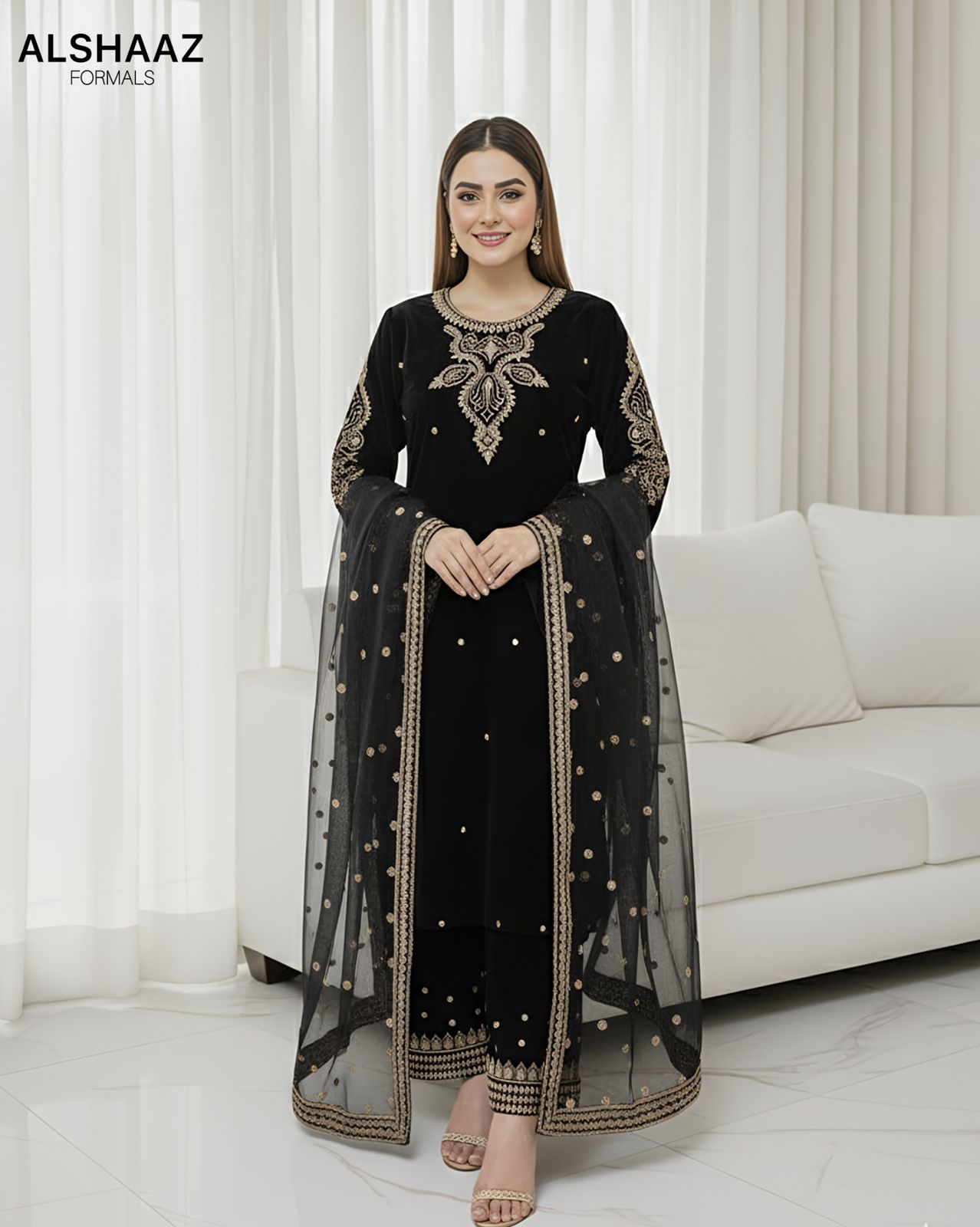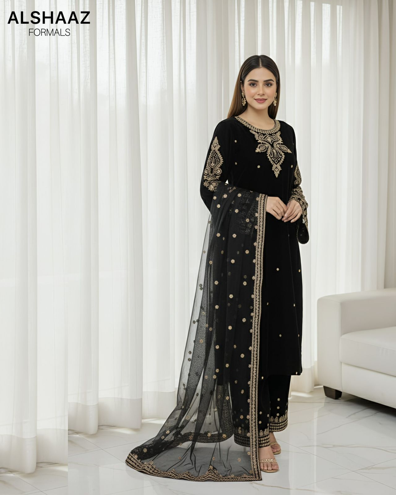 Step into timeless elegance with this luxurious 3-piece micro velvet formal suit. Crafted from premium velvet, this outfit showcases intricate tilla embroidery that adds a touch of regal charm. The ensemble is paired with a beautifully embroidered net dupatta, featuring delicate motifs and a detailed border for a graceful finish.