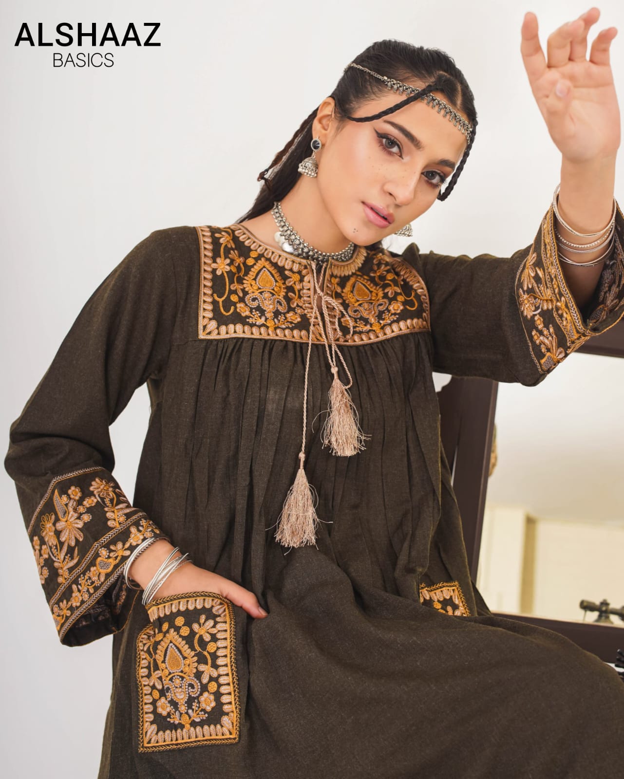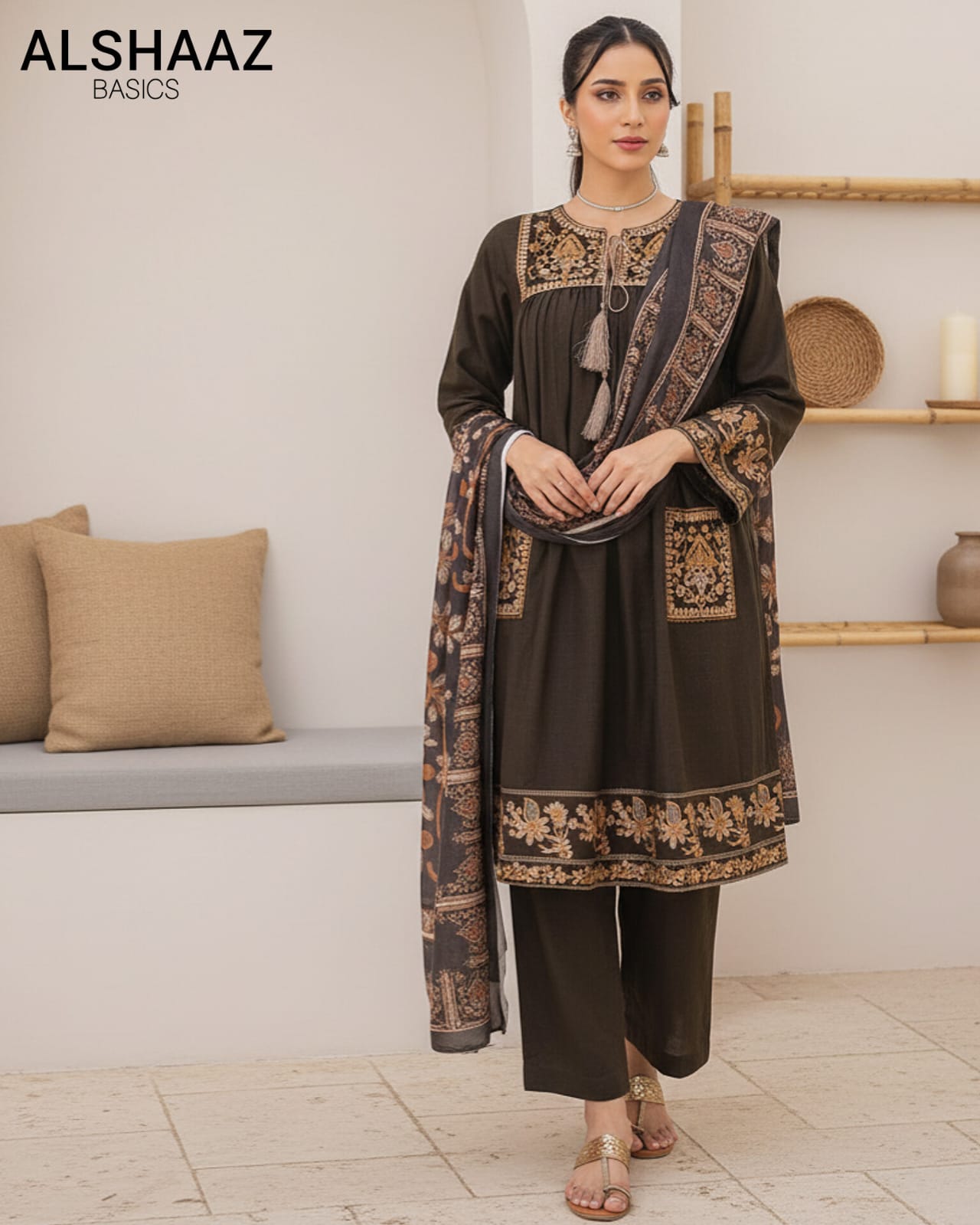 Elevate your winter wardrobe with our Embroidered 3-Piece Wool Ensemble from Alshaaz Basics. This elegant suit features a finely tailored shirt adorned with intricate thread embroidery on the neckline, sleeves, and hemline, paired with a matching pair of trousers and a beautifully printed wool dupatta.