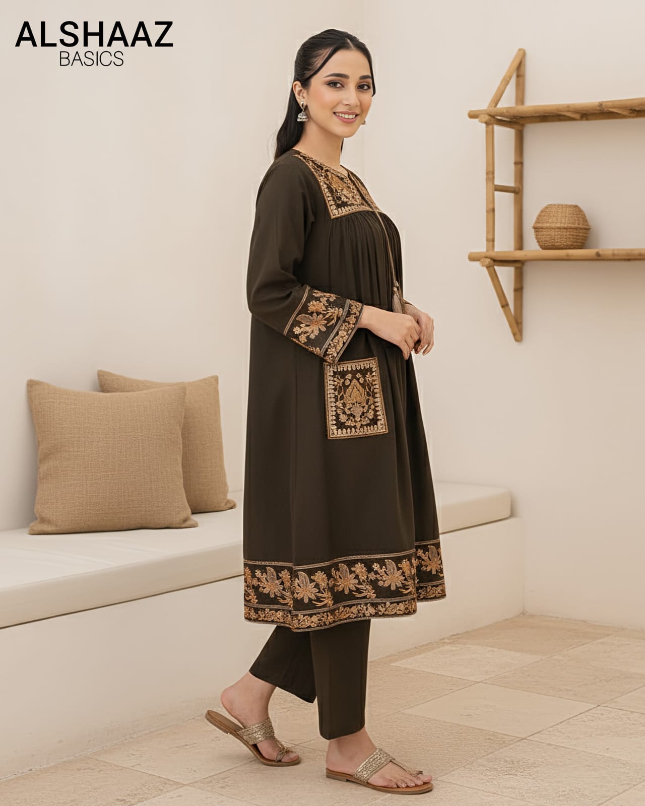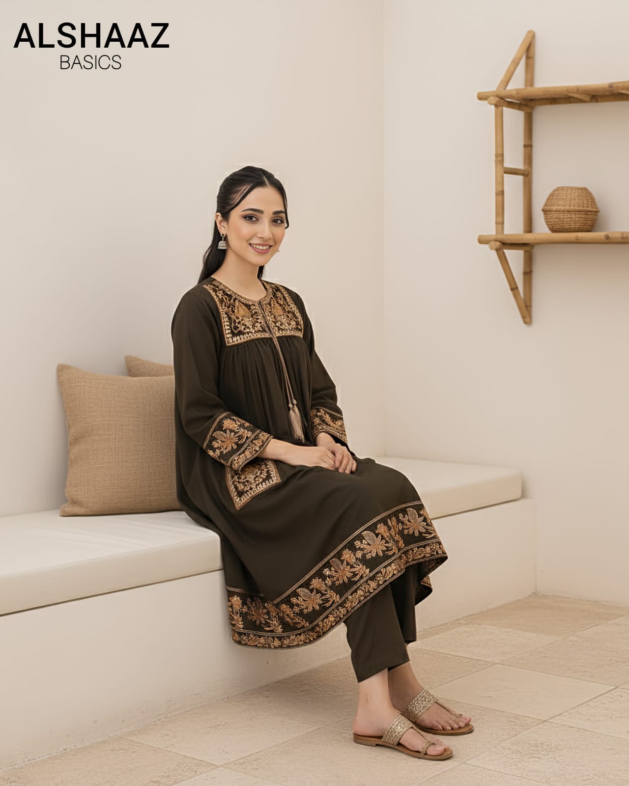 Crafted in soft wool fabric, it offers both comfort and sophistication, making it perfect for casual gatherings or semi-formal occasions. The earthy tones with delicate embroidery add timeless charm, while the lightweight dupatta completes the graceful look.