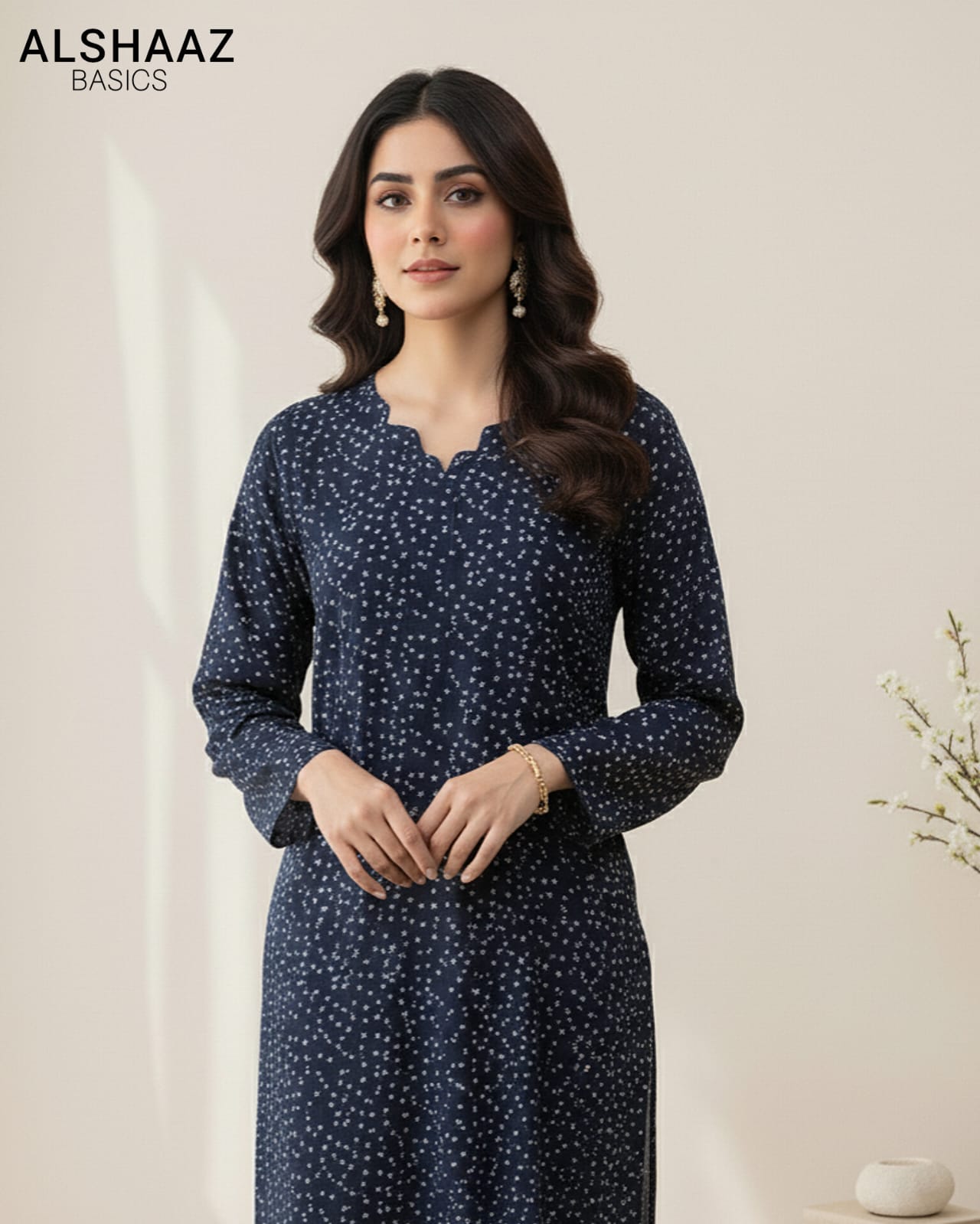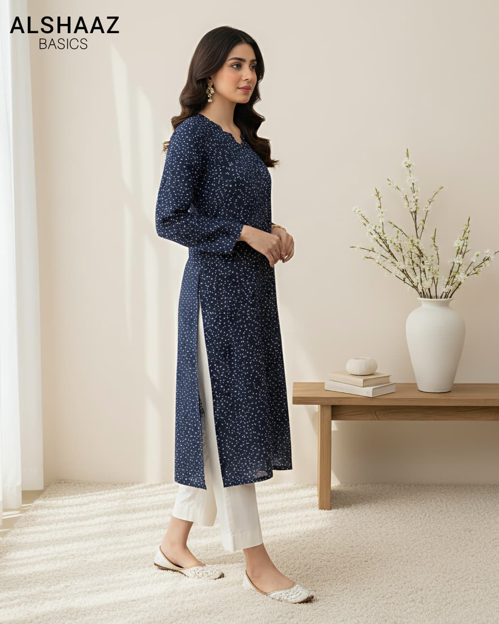 The ensemble comes in a rich navy hue, elevated with delicate dotted prints that add a subtle charm. The kurta features a scalloped neckline and straight sleeves, paired with classic white trousers for a balanced, timeless look.