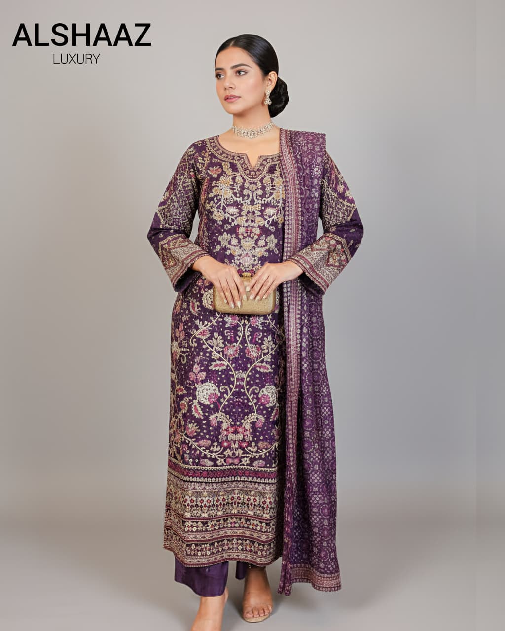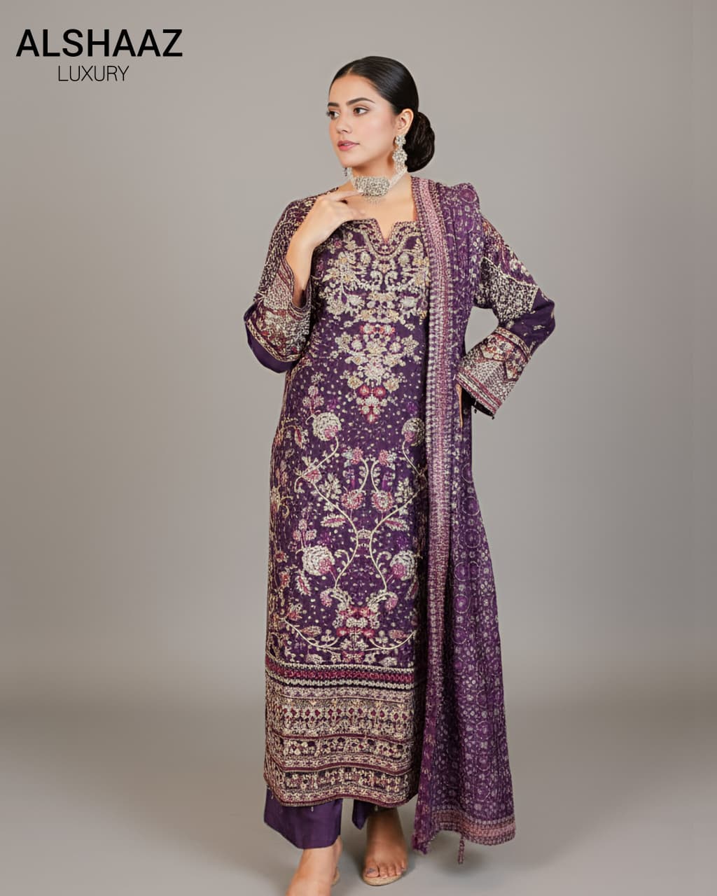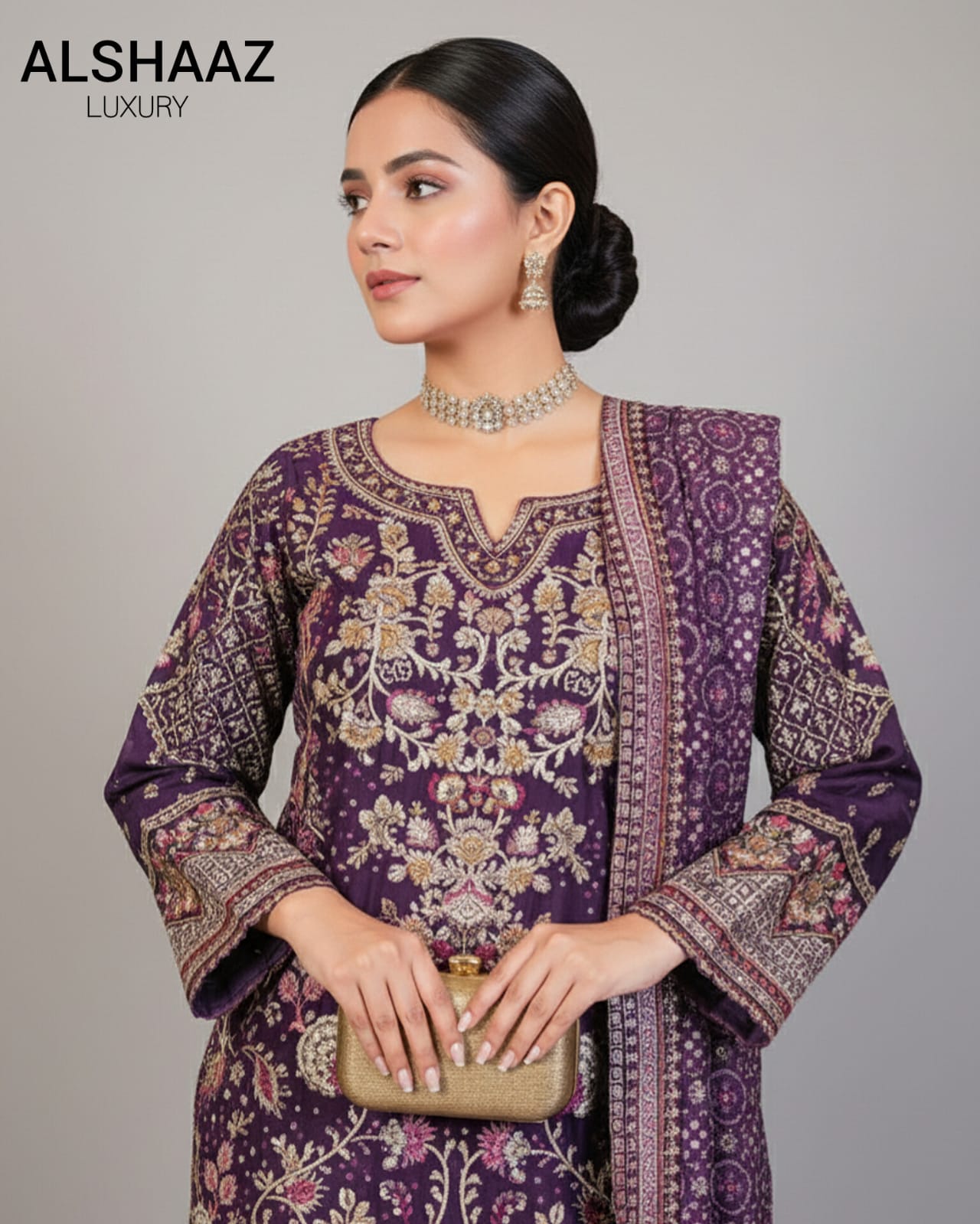 Step into grandeur with our Luxury Purple 3-Piece Ensemble, a true masterpiece of craftsmanship. Designed in rich raw silk, this outfit is heavily embroidered and hand-embellished on both the front and back, showcasing meticulous artistry and regal finesse. The ensemble is paired with a fully embroidered shawl adorned with sequin work, adding an ethereal shimmer to your look. Perfect for weddings, receptions, and festive occasions, this attire defines luxury in every stitch.